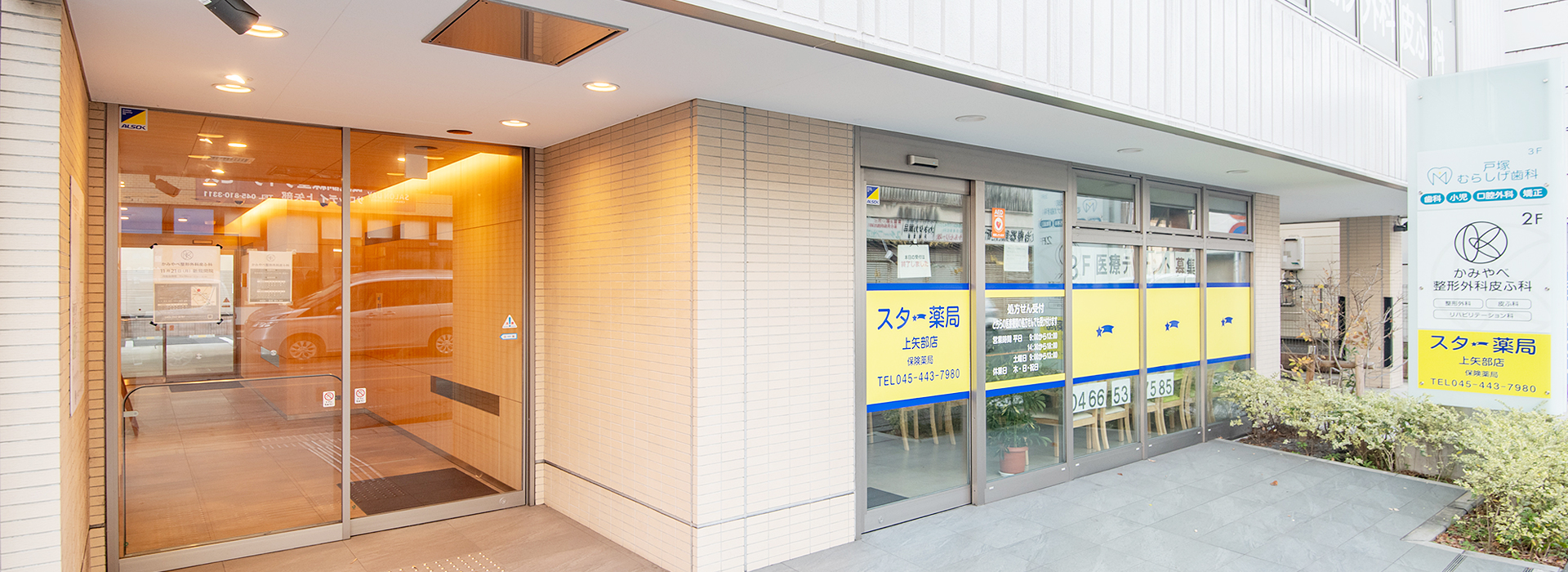 交差点を2つ通過すると左手に見える上矢部クリニックモールの3Fに当院はございます。